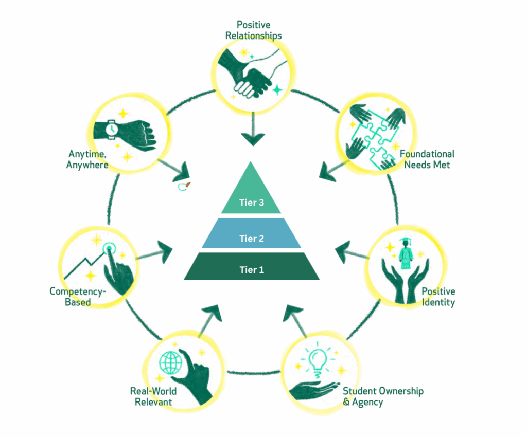 The student-centered learning principles articulate Tier 1 practices that lay the foundation for an equitable learning environment. The principles broaden Tier 1 programs and supports to consider students’ identities, cultures, relationships, passions, and dreams. This foundation is necessary to ensure that Tier 2 and Tier 3 supports are inclusive and effective.